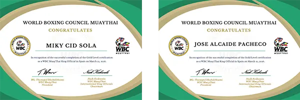 En este contexto, WBC Muaythai ha reconocido a José Alcaide y a Miki Cid con el máximo nivel dorado en el arbitraje, como resultado de su experiencia y participación como oficiales en campeonatos mundiales, así como en la reciente convención celebrada en Bangkok, donde formaron parte activa en todos los talleres oficiales.
